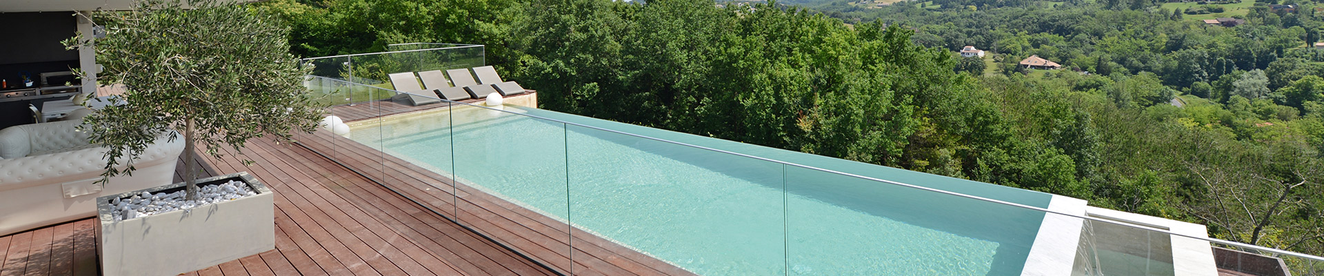 Sa plage en bois exotique fait ressortir la couleur de l’eau, obtenue grâce au revêtement de couleur sable et composé de cristaux de Quartz.
