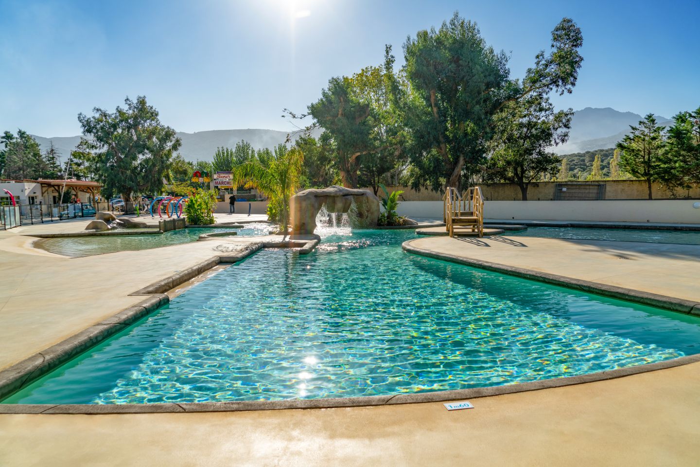 Aquaparc a réalisé un espace aquatique familial pour le camping de la Plage en Haute Corse. Ce camping est doté d’une piscine extérieure chauffée de forme libre. D’une superficie de 312m² l’espace aquatique est composé de :